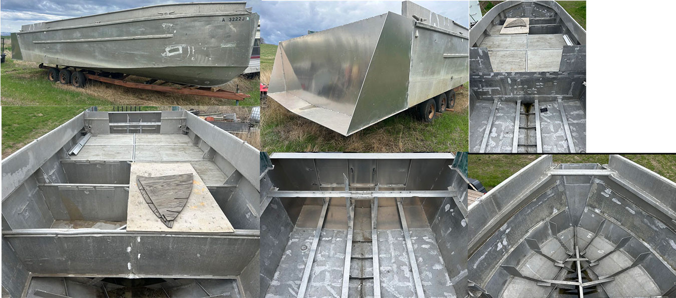 32' long 11'6" wide. 1/4" thick bottom and sides. No engines, no drives, no cabin. It has a title. $18,000. 509-301-2000