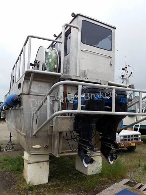 32’x11’ aluminum Bristol Bay bowpicker, built in 1989 by Raider. Set off bow or stern. Twin Mercury 200 hp 2-stroke outboards, new in 1999, mounted on hydraulic lift. (2) hydraulic power packs. Packs appr 12,000# in holds. GPS, VHF, and sounder. Sleeps 4. Very shallow. Reduced to $60,000.