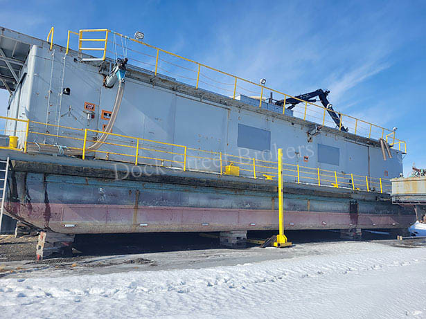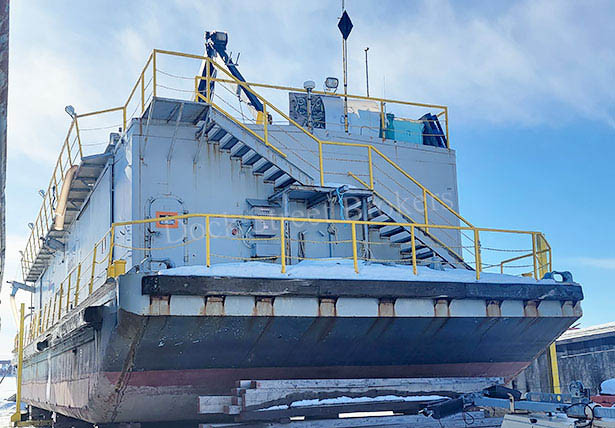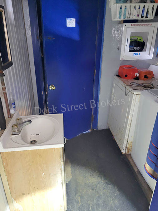 110’x32’x3.5’ steel commercial utility barge built in 1965. Converted to a self contained ice barge in 2008. Built to support the Bristol Bay fishing fleet. Deck level w/ galley, office, laundry, shop, ice room, AC generator space, knuckle crane and heli-pad topside. Below deck contains various pumps, refrigeration system and storage. Auxiliaries include (2) John Deere 6135 w/ 415 kW and (1) John Deere 4045 75 kW. (3) sets of (2) Copeland skid mounted refrigeration units. Ice flake storage area measures 50’x18’ w/ (6) Velmond auger conveyors and 1000 gallon water holding tank. Approx 5,200 gal fuel combined. 3200 fresh water. Full galley, (8) berths, (3) staterooms, (3) heads and showers. Located in Naknek. Inquire for survey. Asking price reduced to $349,000.