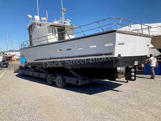 36.1’x12’x5’ fiberglass combination crabber/charter boat built by Modutech 1973. Extensive rebuild w/ shortened house, new floors, bunks, aluminum fuel tank, steering and back deck. Cruises at 10-12 knots. Cat 3208 rated at 375 hp w/ Twin Disc 506 gear. Northern Lights 5 kW genset. 17” Warren Junes block w/ 36 gpm Gressen pump w/ electric clutch and SS cooler. 300 gallons fuel in (1) tank. Includes 250 Custom 36” fully rigged pots, 80#, w/ heavy wire and (400) jars. Electronics include Garmin GPS, (2) VHF, Furuno radar, sounder, inverter and hailer. Microwave, freezer, coffee maker and (2) berths. No fish hold. INCLUDES CA salmon permit and CA 300 pot permit good to 36.1’ max LOA with pots. Asking $150,000.
