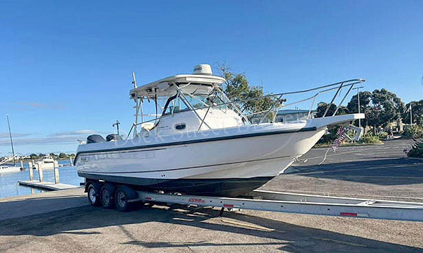 29’x11’x3’ Boston Whaler built in 2004 and rigged for crab and sport fishing. Twin 300 hp Yamaha outboards w/ 1,700 hours each. Fuel capacity of 250 gallons. Does 44 kts WOT. Packs 1,500 lbs in fiberglass fish hold. Electronics include VHF, Simrad GPS, radar, sounder, ploter, and Simrad autopilot. Asking $80,000.