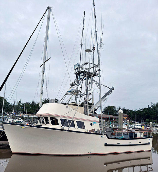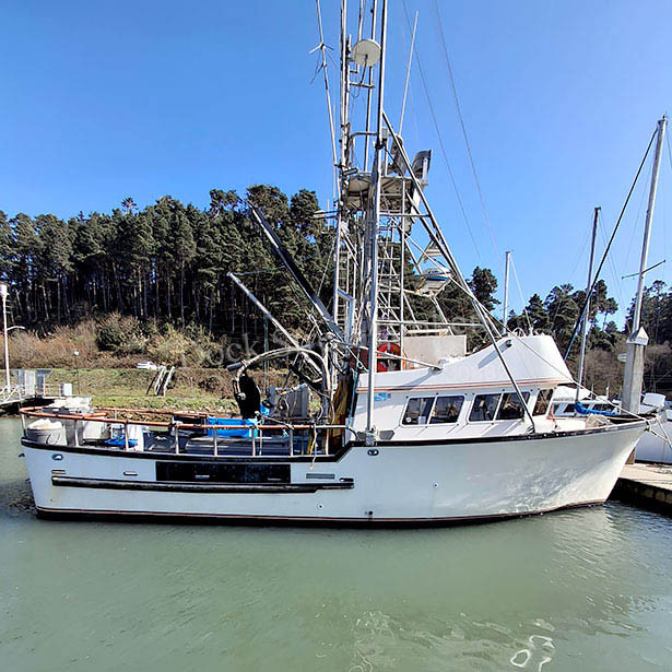 40.9’x13.9’x6’ fiberglass crabber/troller/tuna vessel, built by American Commercial in 1983. Detroit 671 main rated at 200 hp. Twin Disc 506 gear. Champion 400 gas generator. 1,600 gal fuel capacity in (2) tanks. Packs 8 tons salmon and 6,400 crab in aluminum insert. Spray Brine system w/ hydraulic Thermo King compressor. Deck equipment includes 3-spool Simplex gurdies, 17” Junes crab block, crab davit, bait chopper, salmon/tuna landing tables, and more. Excellent electronics. INCLUDES CA/OR salmon permits. Available with 250 pot CA crab permit good to 56’ mloa. Inquire for more info. Asking $225,000.