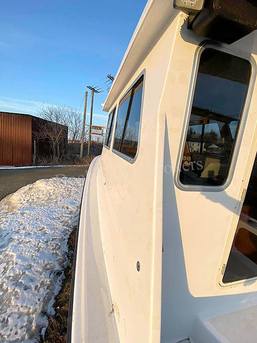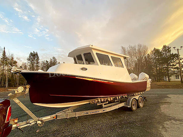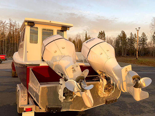 28’x8.6’x2’ fiberglass Miramichi 25 pleasure/sport boat, built by Millennium Marine in 2020. (2) Honda outboards rated at 225 hp each, w/ only 800 hrs. 110 gallon fuel tank. Top speed of 42 kts. Zipwake trim tabs. Deck includes seat with live well, and 30”x30”x18” hold can pack 300 lbs. Cabin includes double berth, galley w/ sink and fridge, head, and hot water. Electronics include 2000w inverter, shore power, VHF radio, and Max Sea chart plotter/sounder. Practically new vessel in immaculate condition. Asking $109,000.