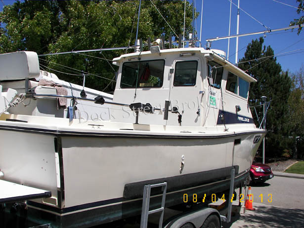 25x8x2.6 fiberglass CA salmon troll vessel and permit package built in 1991 by Farallon. GM 7.4 liter Mercurier Bluewater inboard gas main. Borg Warner/Velvet drive. Cruise at 22 knots WOT 32 knots. 2,000 lbs fish hold capacity. Commercial salmon troll gear and sport charter gear, crab davit, block and crab pots. Electronics include Standard Horizon GPS w/C-map chip, Navtrack GPS, (3) VHF, 24 mile Furuno radar, Furuno sounder and Cetec-Benmar autopilot. Full compliment of safety gear. EZ Loader double axle trailer. Contact us for a complete list of everything that comes with the vessel and a survey. Asking $84,000.