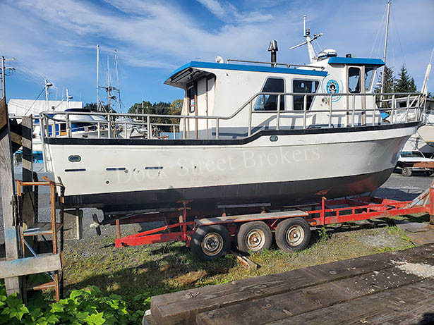 32’x9.7’x5.5’ fiberglass charter/dive boat, built by Hoquiam in 1994. CAT 3116 main rated at 300 hp w/ 2,500 hours. ZF Hurth gear w/ troll valve. 2kw Honda generator. 5gpm Vickers hydraulic pump. Fuel capacity of 275 gallons in (3) tanks. Single fish hold packs 500 lbs. (2) downriggers. Electronics include (2) GPS plotters, (2) VHF, Furuno radar, sounder, and ComNav autopilot. Trailer included. Spare engine available. Inquire for survey. Reduced to $50,000.