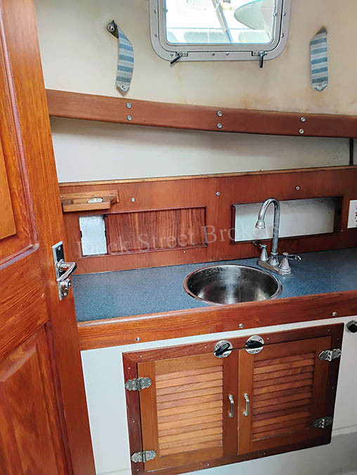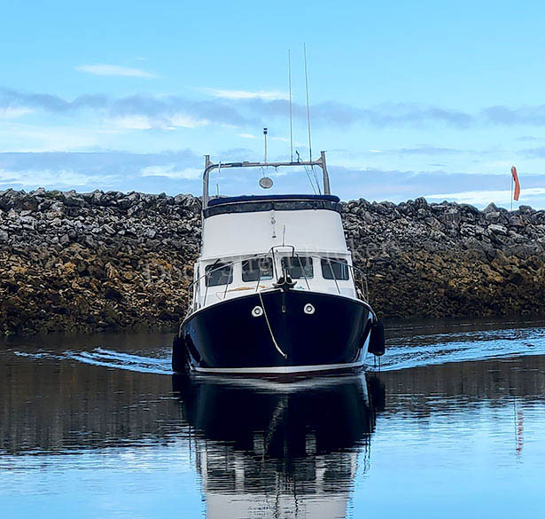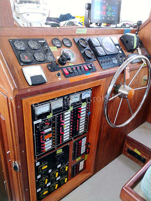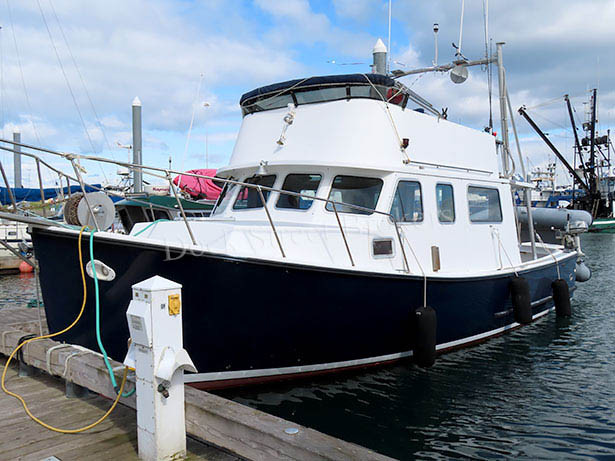 35’x13.5’ fiberglass cruiser built by Rosborough in 1989. Cummins 6CTA8.3 main engine rated at 450 hp. Low hours. Twin Disc 5075SC gear with 2.05:1 ratio. Burns 8 gph at 10 knot cruise, 16 knots top end. 8” bow thruster. 3.5 kW Northern Lights M673D genset. Flying bridge w/steering station. Includes V-berth, dinettte converts to second berth, SS water tank, heating throughout, full galley w/electric stove, microwave, refrigerator, and sink. Marine head and exterior shower. AB inflatable, Viking life raft. Electronics include (2) VHF, computer, sounder, plotter, sonar, and autopilot. Clean vessel. Reduced to $109,000.
