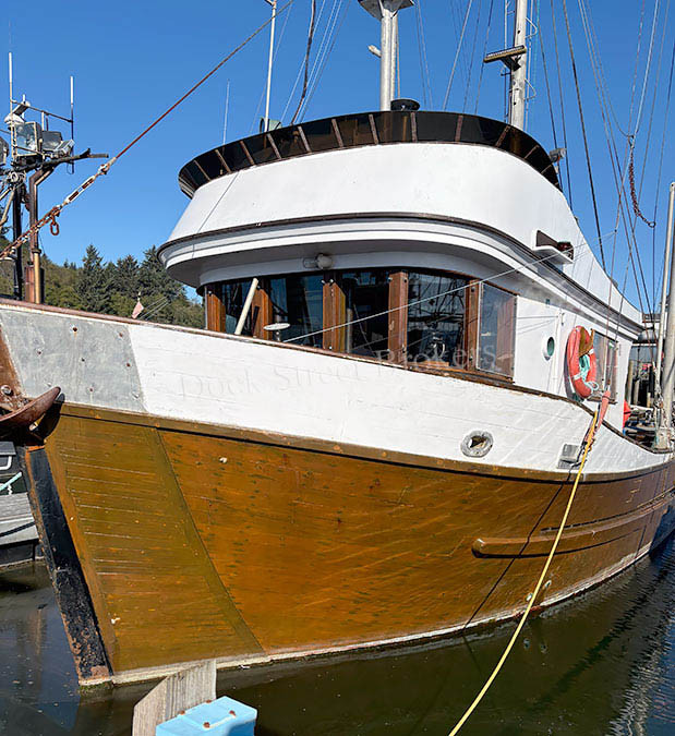 48’x15.5’x8’ wood troller built in 1980 by Wahl Boatyard (Canada). 855 Cummins main reated at 195 hp w/ Twin Disc 509 gear. Kubota aux. Fuel capacity of 1,800 gallons in (4) tanks. Fiberglassed fish hold packs 20,000 lbs. Deck equipment includes 3-spool Easthope gurdies, 20” Kolstrand longline hauler, boom w/ hydraulic winch, and capstan head. Electronics include Furuno GPS, (2) VHF, 2-meter, Furuno radar, Koden sounder, Simrad autopilot, and computer w/ Nobeltec. Asking $160,000.